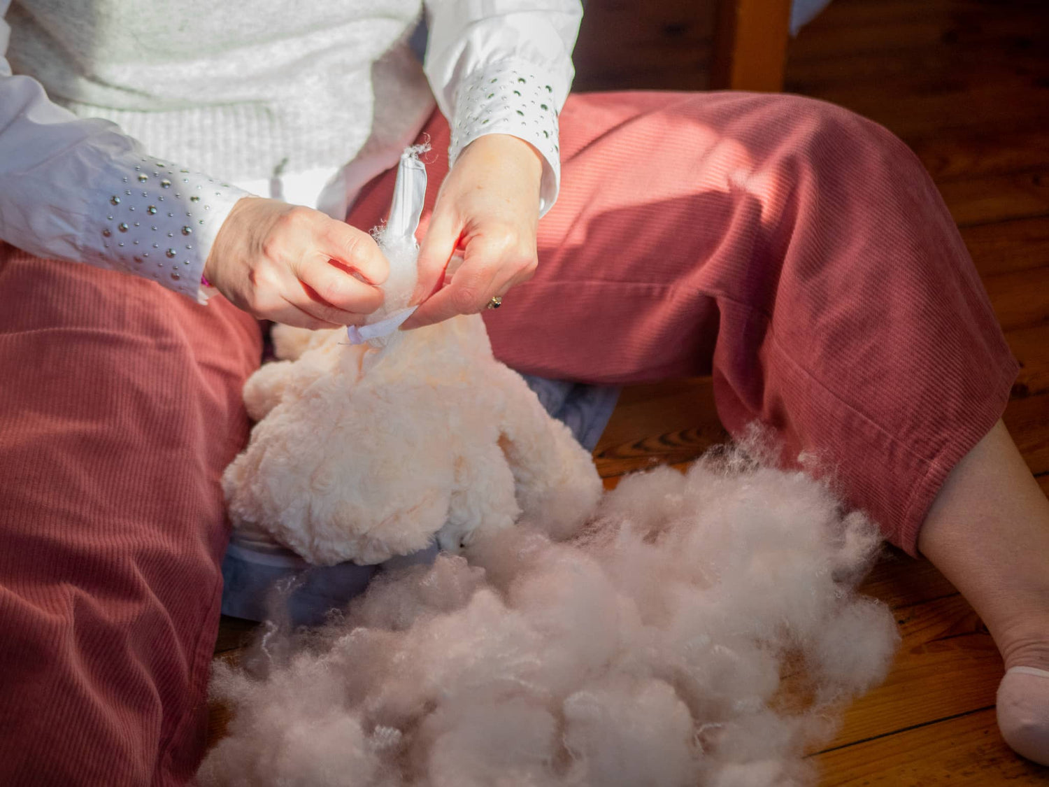 Commencez par ouvrir le sachet et par séparer la garniture pour en faire de petites boules. ATTENTION, il est important de bien faire cette étape pour une peluche bien moelleuse et homogène !
